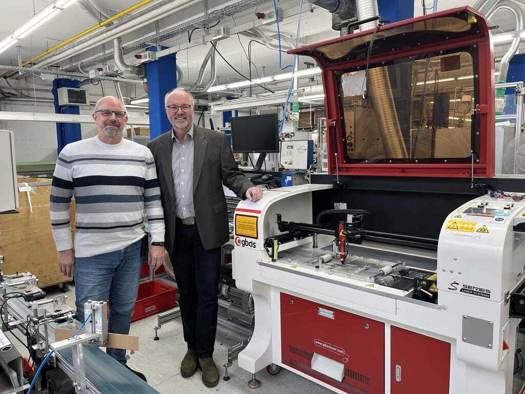 Betriebsleiter Peter Schulze und Geschäftsführer Andreas Oppermann (re.) vor der neu angeschafften Laserschneidanlage nebst KI-gestützter Qualitätsüberwachung. - © Carl Stahl Technical Webbing
