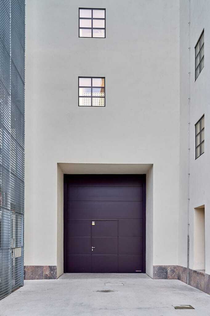 Scapelab gewann den 2009 ausgelobten Wettbewerb für eine Revitalisierung der ehemaligen Zuckerraffinerie zum Kulturzentrum mit der Idee, das Gebäude komplett zu entkernen, um im Inneren ein flexibles Programm anbieten zu können. Das bedeutet, dass auch die Logistik für größere Events ausgelegt werden musste. Zugang für die Anlieferung von sperrigem Kulturgut – seien es große Skulpturen oder die Technik für Bühnenshows – bietet das Industrie-Sektionaltor SPU F42 von Hörmann, das mit einem Vertikalbeschlag ausgestattet ist und senkrecht die Wand hochfährt. Optisch bildet es durch seinen dunklen Farbton einen starken Kontrast zur hellen Betonoberfläche – macht sich gar nicht erst die Mühe, sich zu verstecken. Das doppelwandige Stahl-Lamellentor sorgt für gute Wärmedämmung. Eine Schlupftür dient dem Durchgang von Personen, wenn das Tor geschlossen ist.