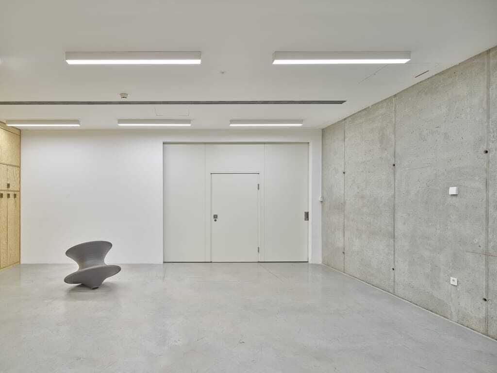 Der völlig desolate Zustand der Cukrarna ermöglichte Eingriffe, die kaum restaurativ zu nennen sind. Lediglich die Außenwände mit den gewaltigen Lochfassaden blieben erhalten. Echte Einbauten im Wortsinne gibt es fast keine. Denn fast das komplette Innenleben der Galerie wurde von der neuen Stahlkonstruktion des Dachs abgehängt. Mit weißen, gelochten Blechen verkleidet, setzt es sich nicht nur räumlich von der historischen Substanz ab. Und das Resultat ist ein atemberaubender Innenraum, der die gigantische Dimension des Bauwerks jederzeit und fast von jeder Position aus fühlbar werden lässt.