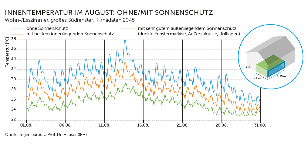 Der voranschreitende Klimawandel bringt in Deutschland häufigere und intensivere Hitzephasen. Wer neu baut oder ein Haus modernisiert, sollte das berücksichtigen. Doch nicht nur die Sommerhitze spielt bei der Planung von Fassaden eine Rolle. In Frühling, Herbst und Winter ist Sonneneinstrahlung erwünscht, da sie kostenfreie Heizenergie und Tageslicht liefert. Wie sich die verschiedenen Bedingungen ganzjährig auf einen Wohnraum mit großer Fensterfläche nach Süden auswirken, hat das Ingenieurbüro Prof. Dr. Hauser untersucht, das auch die Bundesregierung berät. Ergebnis: Mit gutem Sonnenschutz bleiben Räume im Sommer komfortabel, die Fensterflächen liefern Tageslicht und in den kalten Monaten Wärmeenergie.