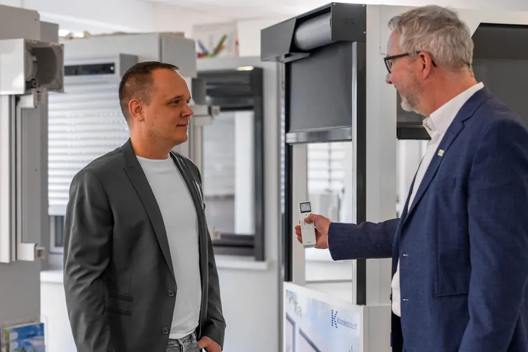 "Wir beschäftigen uns seit vielen Jahren mit Antriebstechnik und verfügen über ein umfassendes Programm", hebt Marcel Klockenhoff hervor. "In Zeiten zunehmender Automatisierung von Rollladenanlagen sowie der wachsenden Nachfrage nach energiesparenden Lösungen decken wir jetzt noch zusätzliche Felder ab." Neben Funk-Motoren wie SE Pro-RC, die kombiniert mit commeo-Produkten ein großes Thema sind, bietet Klockenhoff seit knapp einem Jahr auch den autarken Solar-Antrieb von Selve an. Der Konfektionär montiert den Motor in Anlagen für Vorbaurollläden. Das Solar-Set mit Solarpanel und leistungsstarkem Akku wird laut Marcel Klockenhoff von immer mehr Fachkunden angenommen. Denn gerade für die Renovierung sei es eine saubere Lösung. "In der schnellen Montage liegt der Mehrwert für unsere Fachkunden", so der Geschäftsführer. "Wir lernen bei uns den Multi-Send-Handsender zur Steuerung ein, sodass sie bei der Installation vor Ort nur ein paar Schrauben an der Wand befestigen müssen und nach der ersten Probefahrt direkt fertig sind."