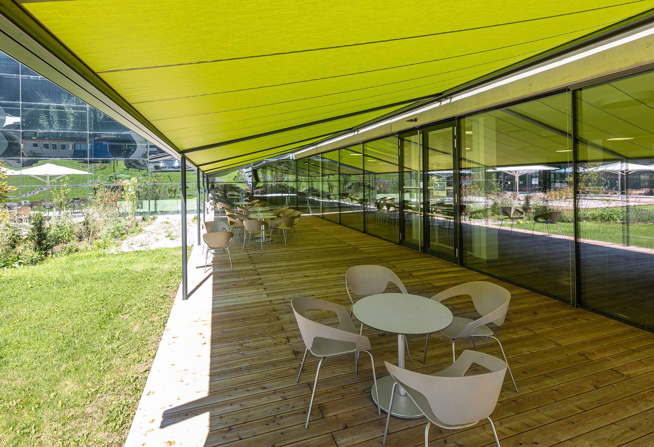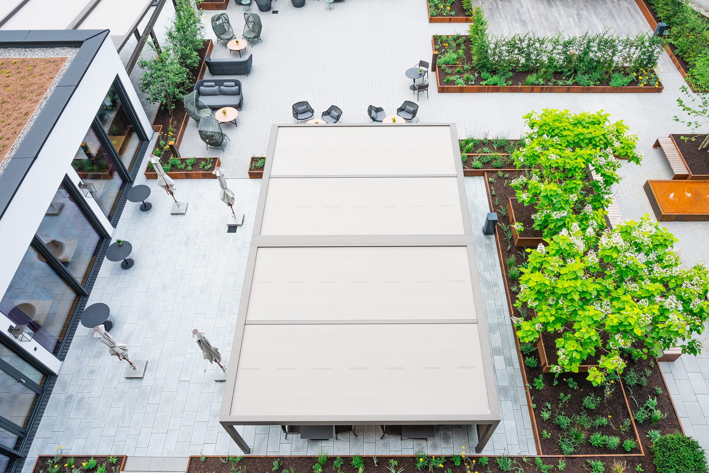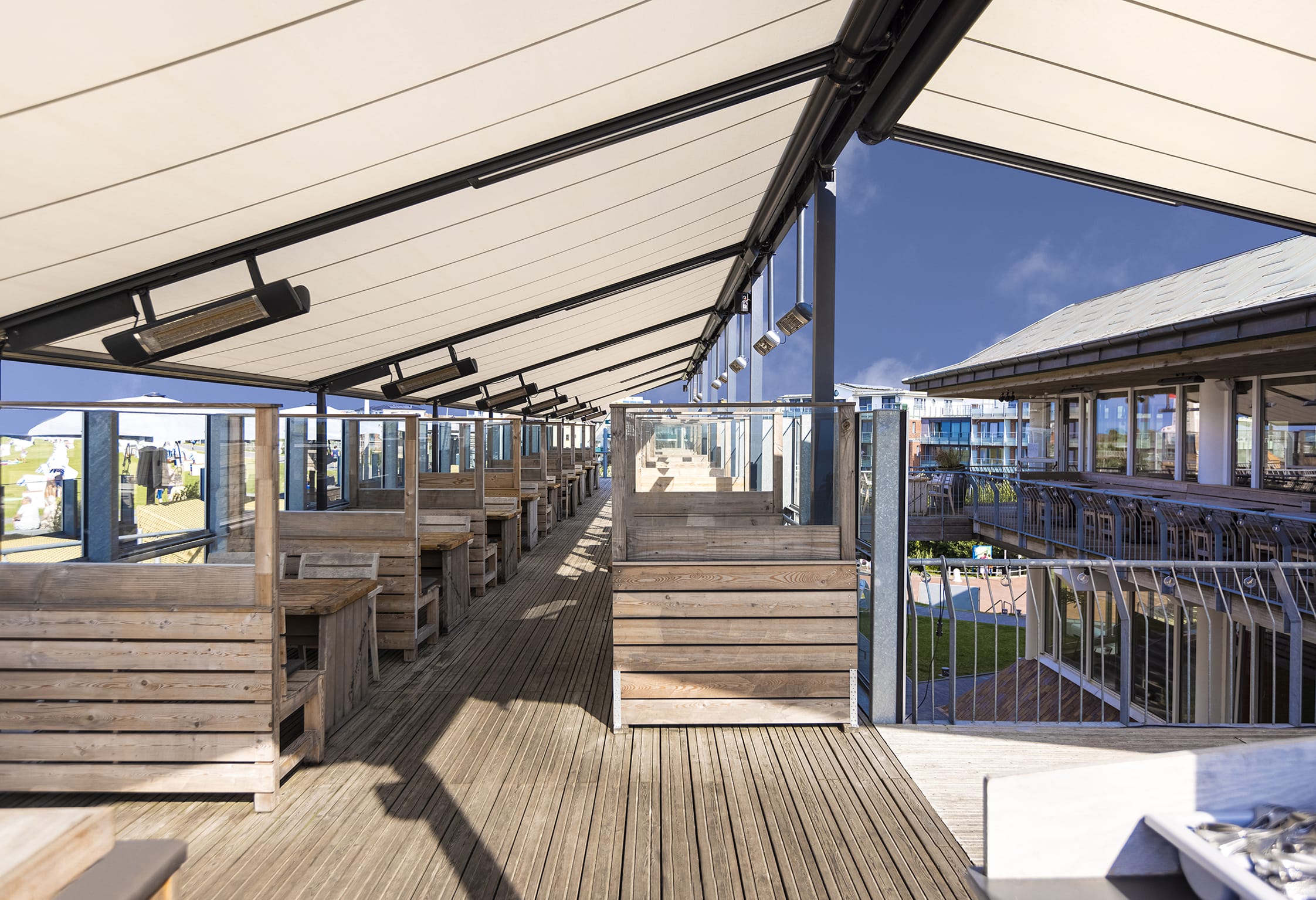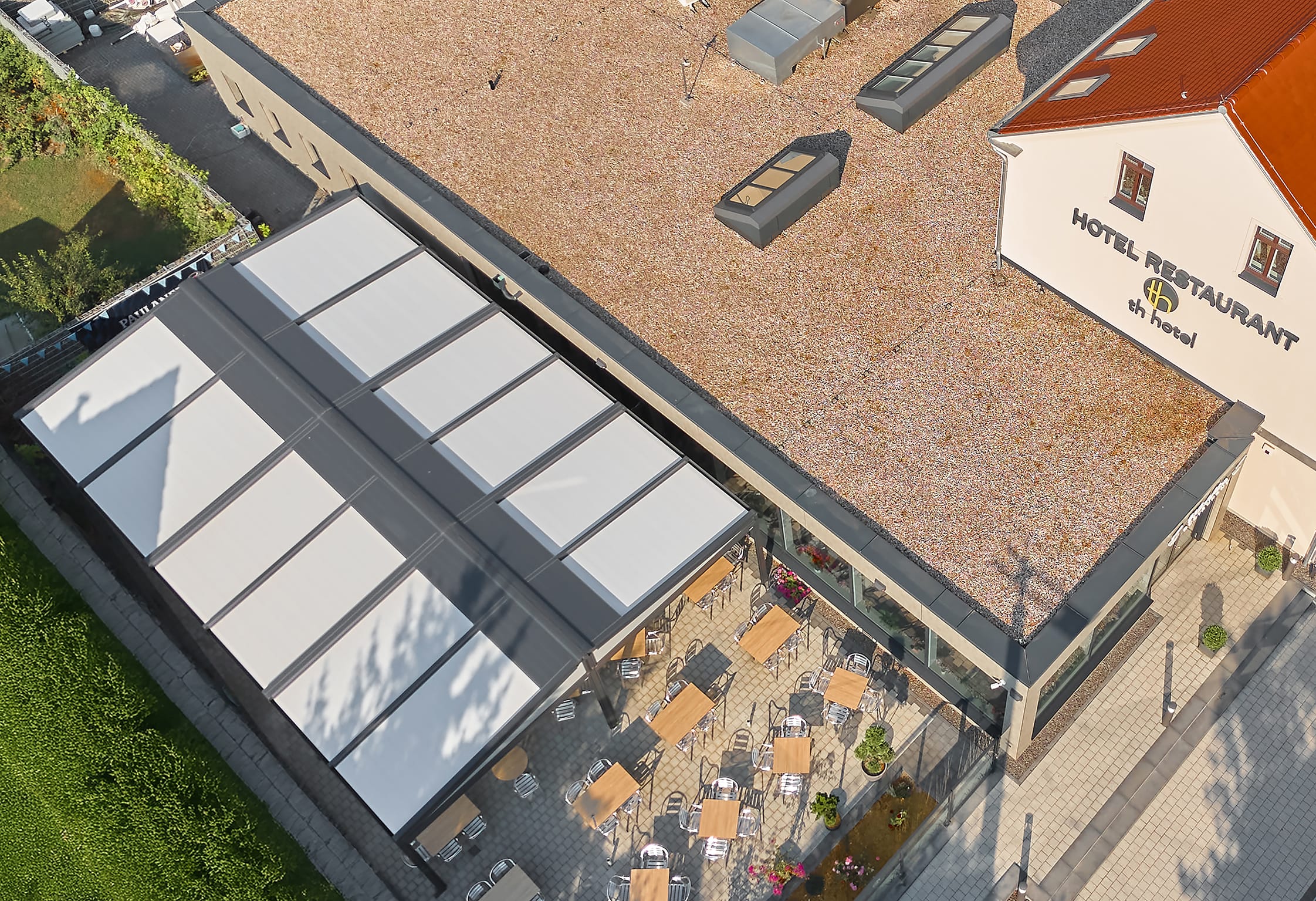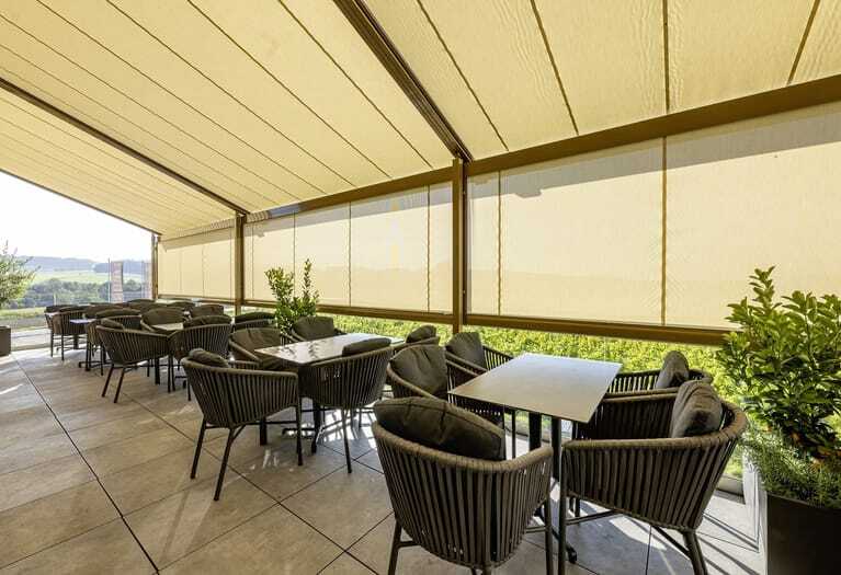 Großflächenbeschattung ist für die Gastronomie, Industrie, Handel, öffentliche Einrichtungen und große Architektenobjekte ein wichtiges Thema geworden. Das Team von Markilux Projekt bietet hier gemeinsam mit qualifizierten Fachbetrieben einen zuverlässigen Service an. - © Markilux