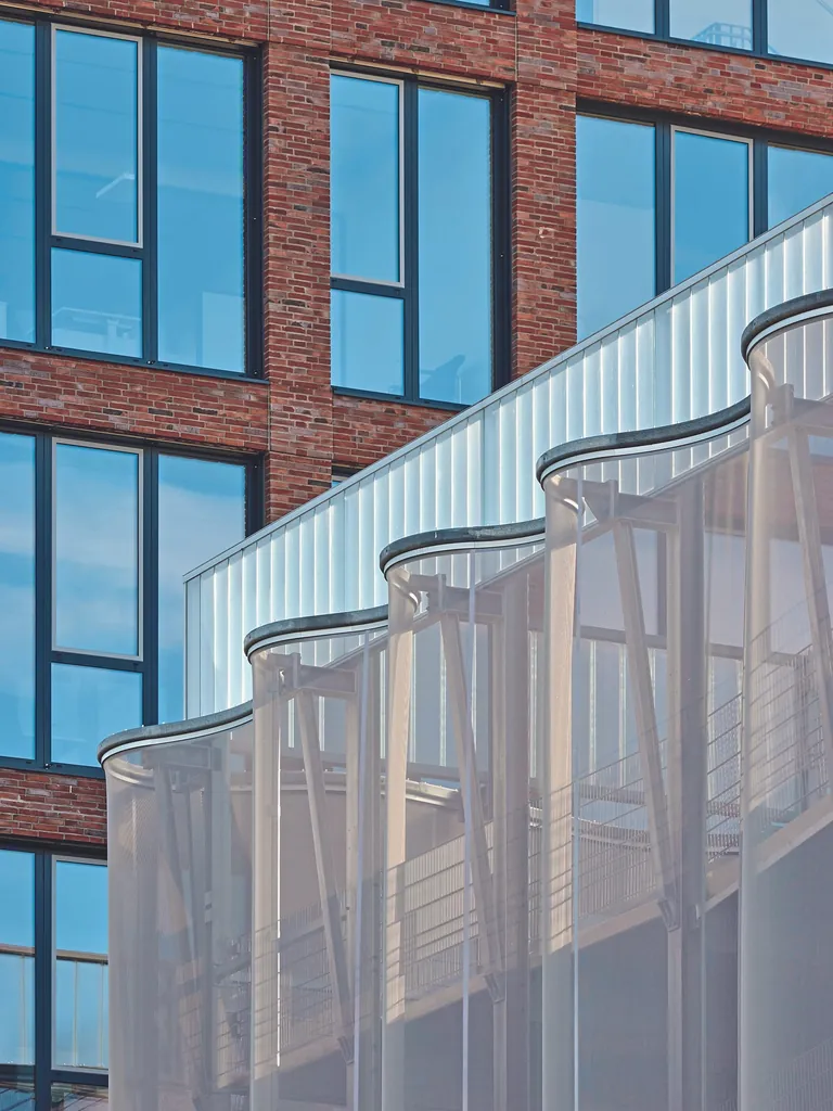 Schnell wurde klar, dass sich die gewaltige Freiform mit einer Länge von 360 Metern und einer Höhe von rund elf Metern nur mit einer Textilmembran bauen lässt. Um die visuelle Wirkung des Bauwerks für die gegenüberliegende Wohnbebauung ansprechend zu gestalten, wurde es straßenseitig als Fassade in Form eines wellenförmigen Vorhangs aus dem Gewebe Frontside View 381 von Serge Ferrari umgesetzt.