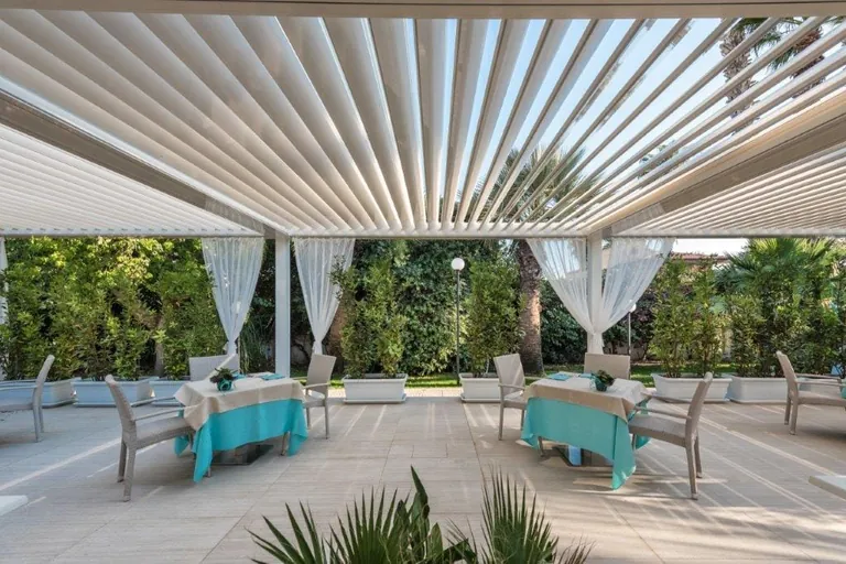 Sechs unabhängige Module der bioklimatischen Pergola Gennius Kedry Prime sind in Ragusa nebeneinander installiert. - © KE Protezioni Solari