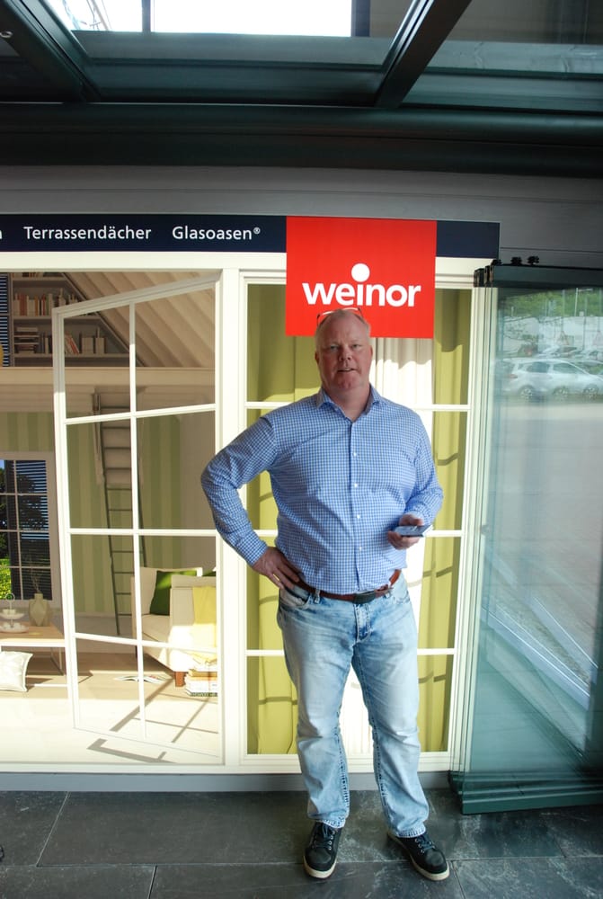 Um ihre Ausstellung aufzuwerten, stellt Weinor seinen Fachpartnern acht Wohnwelt-Motive als Leuchtdisplays zur Verfügung. Sie bestehen aus einem lichtdurchlässigen Textildruck inklusive Alurahmen mit LED-Rückwand. Zwei dieser 380 mal 210 Zentimeter großen Displays stehen seit wenigen Wochen in der Ausstellung von Optimal Bautechnik in Schweninental und illustrieren, wie die Glasoase und das Faltdach PergoTex von Weinor in einer konkreten Wohnsituation wirken. „Wer von seinen Kunden zwischen 25.000 und 35.000 Euro für eine Glasoase verlangt, der muss eine hochwertige Ausstellung zeigen“, sagt Inhaber Uwe Krause. Durch die 3D-Wirkung der von hinten beleuchteten Wohnmotive gewinne der Kunde einen besseren Eindruck davon, wie das jeweilige Produkt an seinem Gebäude aussehen könnte. „Das hilft bei der Kaufentscheidung und ist für uns eine Argumentationshilfe“, führt Krause aus, der seit 22 Jahren Fachpartner von Weinor ist.