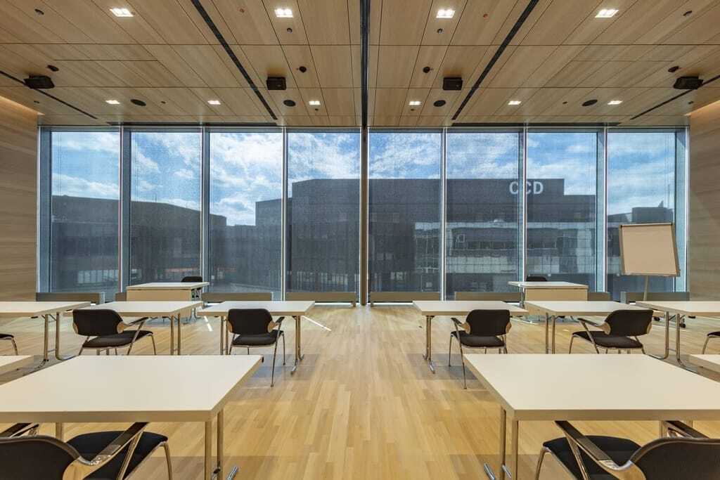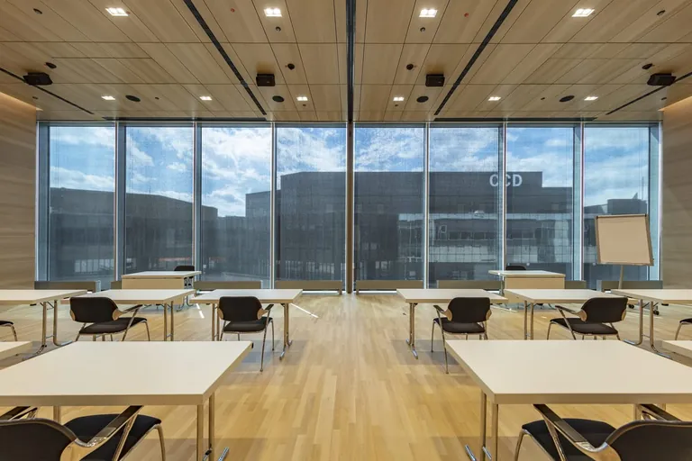 Da das Gebäude von der Typologie her einen Versammlungsraum darstellt, mussten die Architekten auch erhöhte Brandschutzanforderungen berücksichtigen. In der Endwertung ganz oben landete schließlich das Screenmaterial Soltis SK20 von Serge Ferrari, das speziell für öffentliche Gebäude und Verwaltungsbauten mit hohem Publikumsverkehr entwickelt wurde.