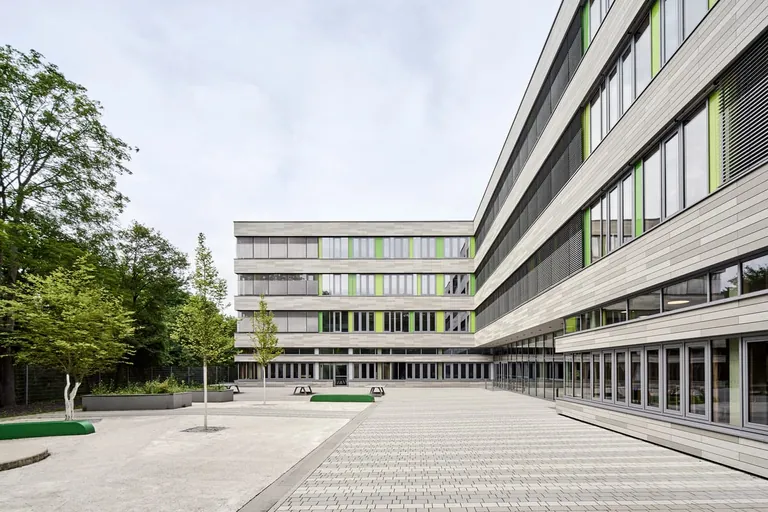 Die Carl-von-Ossietzky-Gesamtschule in Köln-Longerich ermöglicht zirka 1.000 Schülerinnen und Schülern sowie Lehrpersonal ein Lernen und Lehren im Grünen. Für optimale Lichtverhältnisse und sommerlichen Wärmeschutz sorgen 415 Außenraffstores, die sich mit den verbauten SMI-Antrieben sehr präzise justieren lassen.