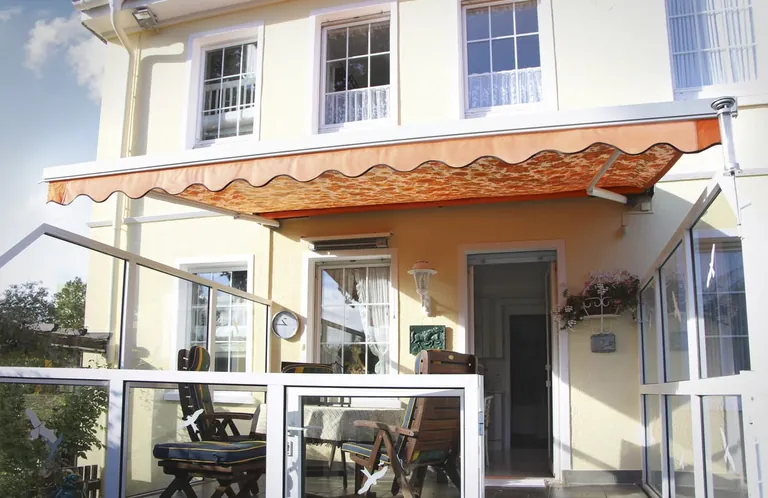 Auch weiterhin wäre die Vintage-Markise voll funktionstüchtig gewesen – doch war nun die Zeit für ein Upgrade gekommen. Eine Mieterin, die das erste Obergeschoss bewohnt, hatte vorne am Gebäude die Weinor-Kassettenmarkise Semina Life mit Volant Plus und LED-Beleuchtung anbringen lassen. Der Besitzer, der das Haus seit 1962 bewohnt, zog nach – auch weil das Haus einen neuen Anstrich bekommen hatte. „Die alte Markise passte da nicht mehr dazu“, erläutert Borsutzky im Gespräch mit sicht+sonnenschutz . Er entschied sich ebenfalls für das Modell Semina Life – mit Motor, Funksteuerung und LED-Beleuchtung für die Abendstunden.