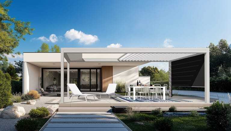 Herzstück des Designs ist das flexibel konfigurierbare Dachsystem: Die Lamellen lassen sich nicht nur bis zu 160 Grad verstellen und komplett einziehen, sondern auch zonenweise steuern. Die Dachaufteilung ist frei wählbar – z. B. zur Hälfte oder im Verhältnis ein Drittel/zwei Drittel, ganz nach gewünschter Licht- und Luftführung. Weitere Konfigurationen sind möglich.