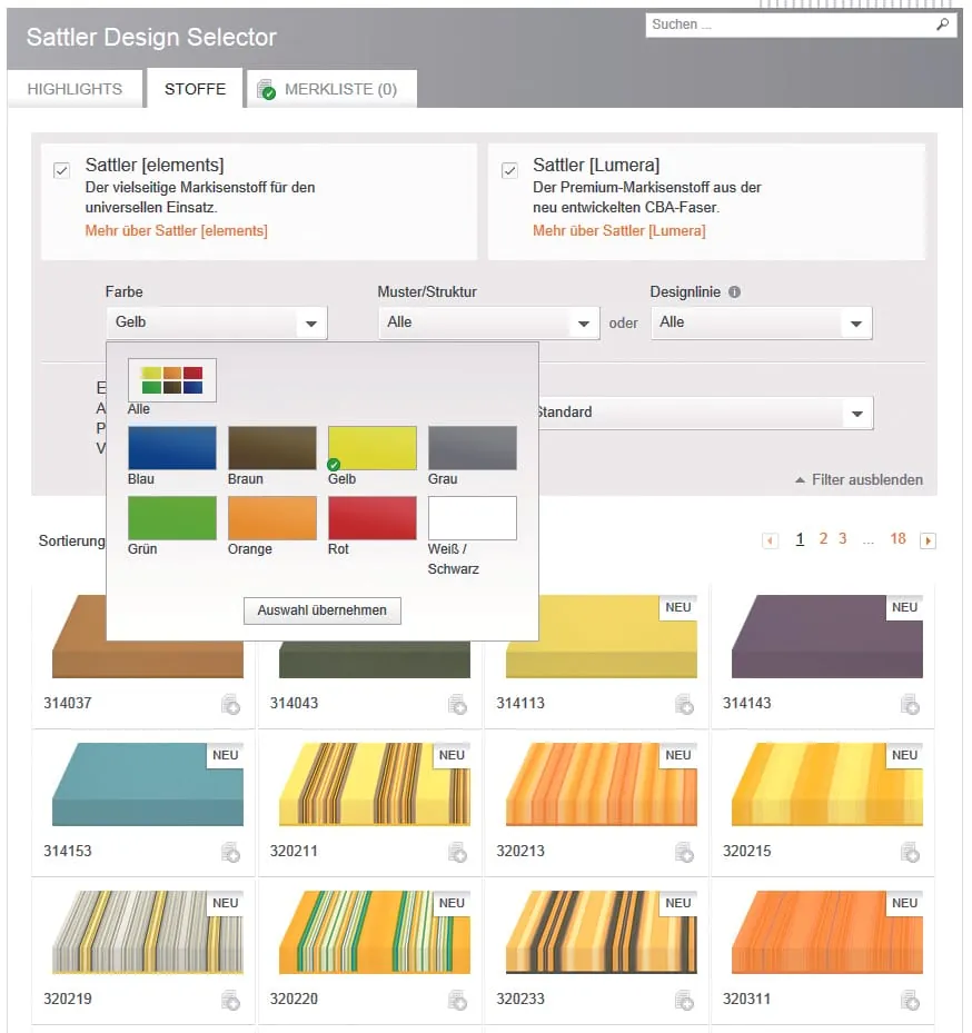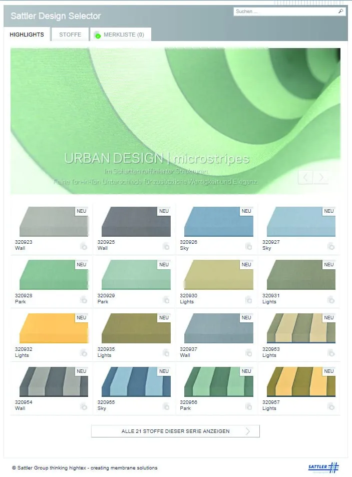 Im Ladengeschäft fühlen sich manche Kunden zeitlich unter Druck gesetzt, möchten Mustervarianten mit nach Hause nehmen und zögern den Kaufabschluss hinaus. Um für Kunden die Vorauswahl zu vereinfachen und den Fachhändler zu unterstützen, hat Sattler den Markisen Design Selector entwickelt.