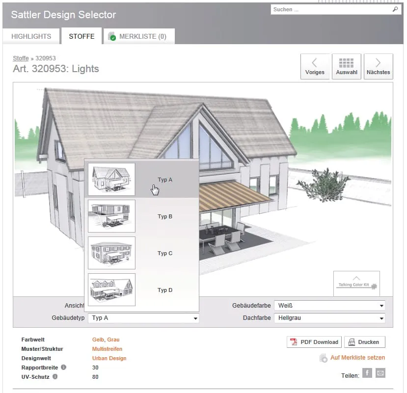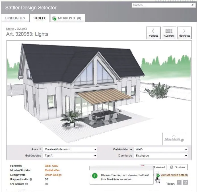 Mit diesem Tool hat der Kunde Zugriff auf das gesamte Sattler-Markisenprogramm. Mit einem Klick auf ein Tuch gelangt er in die Design-Ansicht. Hier hat er verschiedene Einstellmöglichkeiten: Er wählt Haustyp, Gebäude- und Dachfarbe aus. Das gewählte Dessin erscheint am vordefinierten Haus.