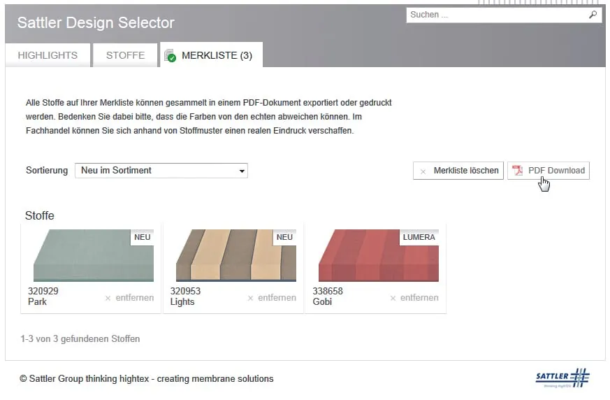 Hat der Kunde alle interessanten Dessins auf seine Merkliste gesetzt, exportiert er diese in ein PDF-Dokument, das das Dessin, die Artikelnummer und den UV-Schutz-Wert des