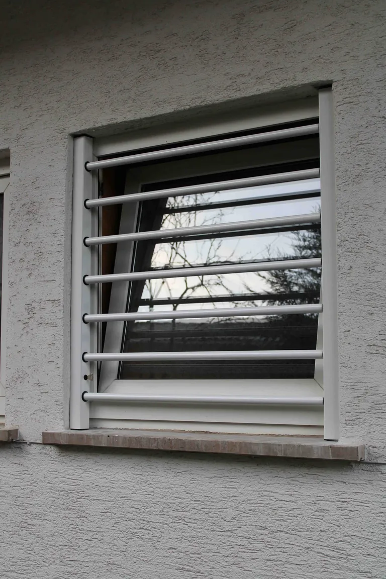 Das Gittersystem T82 ist in der Widerstandsklasse RC2 geprüft. Der Rahmen besteht aus stranggepressten Aluminiumprofilen mit Stahlverstärkung. In den herausnehmbaren Gitterstäben sorgen Spezial-Rundstahleinlagen für Stabilität und Einbruchschutz.