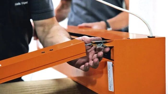 Schritt 5: Im nächsten Arbeitsschritt ist es notwendig, den roten Sicherungsstreifen von der Aluschiene zu lösen und den Seilzug nach oben zu ziehen. "So entriegelt der Fachhandwerker die Behang-Führungsschiene, um an die darunter befindlichen Bohrlöcher zu gelangen", sagt Rosenheinrich. Lassen Sie das Seil auf keinen Fall los, da es sonst durch die nun gespannte Feder in die Schiene gezogen wird. Durch die mitgelieferte Montagehilfe fixieren Sie dem Hersteller zufolge die Behang-Führungsschiene in der ausgefahrenen Position, ohne dass Sie den Seilzug anhaltend unter Spannung halten müssten. Richten Sie die Schiene anschließend per Wasserwaage aus und setzen Sie die erste der unteren Befestigungsschrauben. Jetzt entnehmen Sie laut Roma die Montagehilfe wieder und führen diese in die Schiene zurück, ohne sie zu verriegeln. Um den unteren horizontalen Abstand zu ermitteln, legen Sie den Abschlusswinkel als Montagehilfe ein. Mithilfe der seitlich aufgeklebten roten Bänder ist nach Aussage des Herstellers ein Spiel von zirka einem Millimeter je Seite gewährleistet. Setzen Sie, nach erneuer Überprüfung mit der Wasserwaage, nun die zweite Schraube.