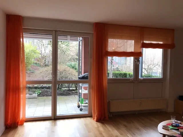 Mareike Weigand kümmerte sich um den Neubezug einer Wohnung in Darmstadt. Die gelernte Raumausstatterin stattete dabei das Wohn-, Arbeits- und Schlafzimmer der Wohnung aus. Um im Wohnzimmer für viel Farbe zu sorgen, fiel ihre Wahl bei der Gestaltung auf eine Kombination aus Raffrollos (Spin von MHZ) und Vorhang mit Aluschiene. „Die Kunden wählten ein mutiges und farbenfrohes Orange des Stoffherstellers Saum & Viebahn mit Brandy 517530105“, sagt Weigand. Die Vorhangschienenmanufaktur Ludwig Schäfer lieferte die zusätzlich benötigte Aluschiene. Zusätzlich verarbeitete die Raumausstattermeisterin den Stoff mit einer 1er-Falte und aufstehend, sodass der Vorhang sich schön an das Fenster anschmiegt und fällt.