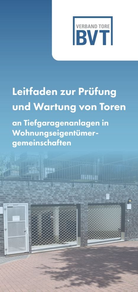 Um auf diese Problematik aufmerksam zu machen, hat der BVT - Verband Tore einen praxisnahen Leitfaden erarbeitet, der alle wesentlichen Aspekte zur Prüfung und Wartung von Tiefgaragentoren beleuchtet. Der Flyer richtet sich insbesondere an Wohnungseigentümergemeinschaften, die diesem Thema bisher wenig Beachtung geschenkt haben. "Mit unserem Leitfaden möchten wir Verantwortliche sensibilisieren und ihnen eine klare Orientierung geben, wie sie die Sicherheit an ihren Anlagen gewährleisten können", erklärt BVT-Geschäftsführer Kai-Uwe Grögor.