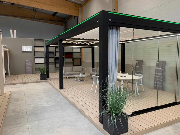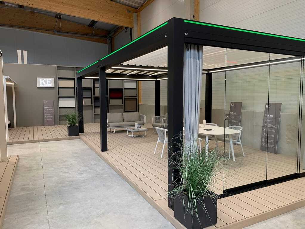 Die Ausstellung zeichnet sich durch ein Showroom-Konzept aus, das darauf abzielt, Besucher bei einer Tour durch die verschiedenen KE-Produkte einzubeziehen und zu informieren. Dort finden sich die neuen bioklimatischen Lamellendächer – besonders geeignet für Projekt im Gastro- und Hotelbereich – sowie Pergolen und Sonnensegel.