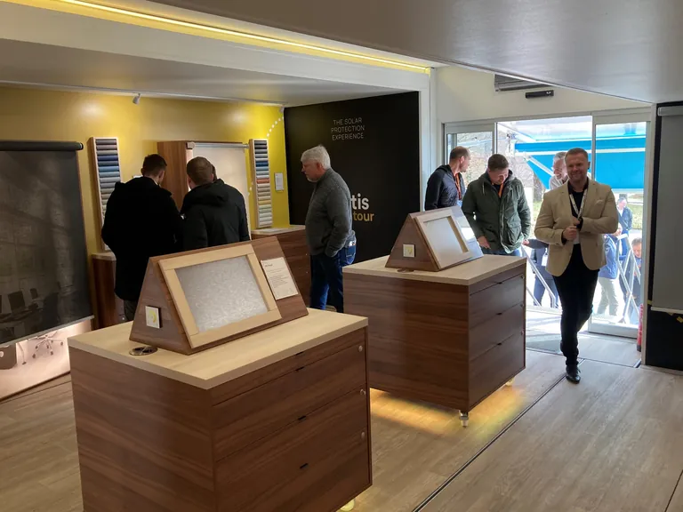 In dem Showtruck erhielten die Besucher einen umfassenden Einblick in die Soltis-Sonnenschutzwelt. Präsentiert wurden die neuesten Gewebe der Soltis-Kollektion. - © Dirks