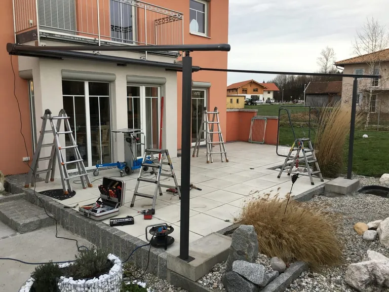 Bei einem neuen Auftrag montierte das Montageteam von Jalousien Huber die Pergolamarkise PM von Erhardt. Dass die Profis für den Job einen zweiten Tag benötigten, war nicht geplant. Der starke Wind ließ die abschließenden Einstell arbeiten aber nicht zu. „Wir konnten die Markise gar nicht ausfahren. Der Wind hat sich so im Tuch verfangen, dass man direkt gesehen hat: noch weiter – und es geht etwas kaputt“, sagt Moritz Reiser.