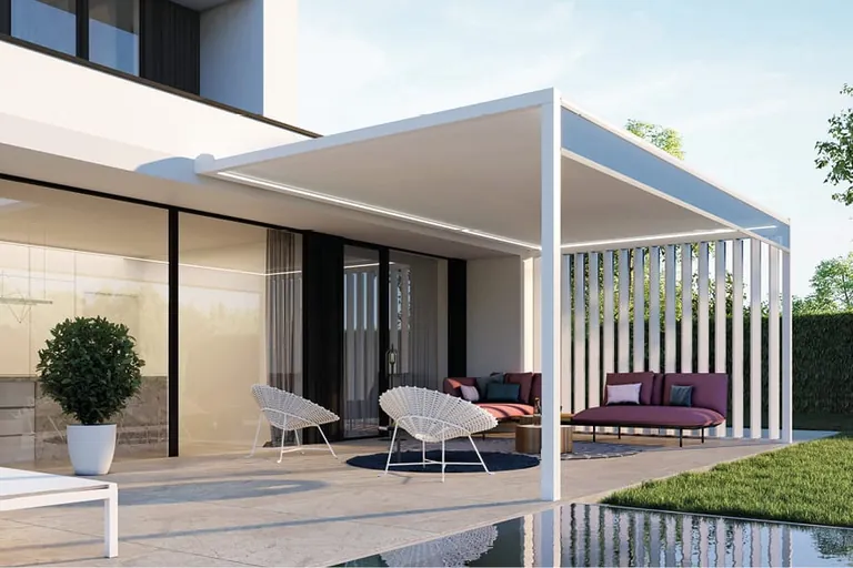 Die Pergola Zip wird in zwei Modellausführungen angeboten. Zum einen mit Neigungsdach und integrierter Regenwasserableitung. Zum anderen als Zip Cube mit horizontalem Dach und einem moderneren Look. Beide Terrassenüberdachungen werden an der Gebäudewand montiert und haben ein ausziehbares Markisentuch.