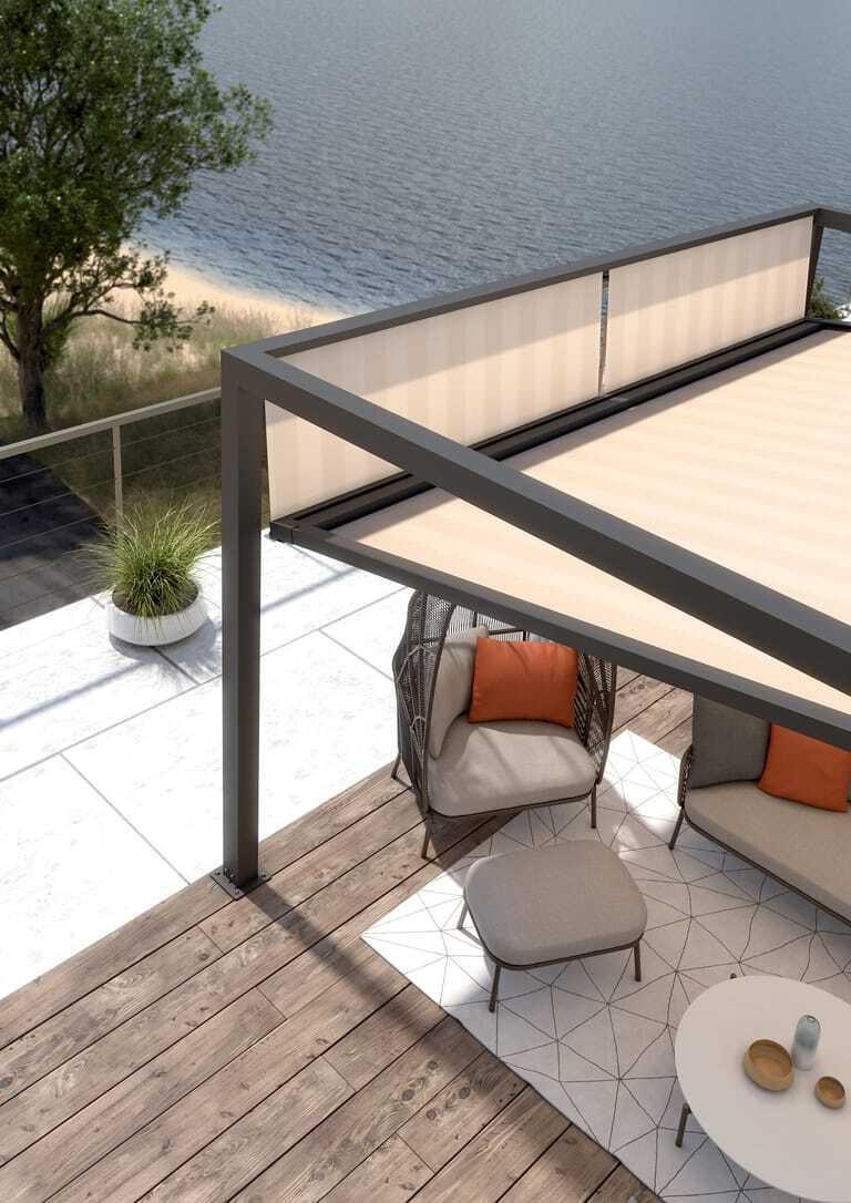 Neben seiner bewährten Technik punktet der Q.bus mit maximalen Abmessungen bis 600 mal 400 Zentimeter bzw. 550 mal 450 Zentimeter. Der mögliche Ausfall bis 450 Zentimeter prädestiniert das Pergolasystem für die Beschattung von besonders großen Flächen.