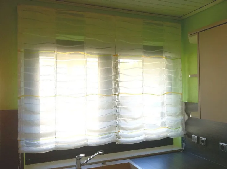 In Hameln brachte Roman Ackermann zwei Raffrollos an einem Küchenfenster an – als Dekoelement und als Sichtschutz.