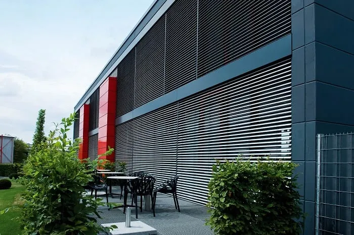 An der Alufassade des Verwaltungsgebäudes sind 17 aufgeständerte Raffstores mit Schienenführung angebracht, darunter zwei Einzelelemente und sechs Kombinationen mit zwei, drei und vier Elementen. Silvanus als Fachbetrieb hat Befestigungspunkte in der Aluminiumverkleidung definiert und die Befestigung ausgeführt. Die Länge der Fassade erforderte ein Höchstmaß an Präzision, so entstand der optische Eindruck, es handle sich bei der Verschattung um einen großen Raffstore.
