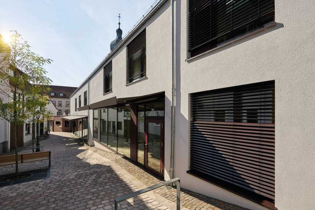 Die Altstadt von Marktheidenfeld lebt von ihren romantischen Gassen und ihrer Kleinteiligkeit. Genau hier, gut erreichbar zwischen Volkshochschule und Marktplatz, sollte der Neubau der Stadtbibliothek Marktheidenfeld entstehen. Der Entwurf von RitterBauerArchitekten aus Aschaffenburg platzierte einen langen schmalen Riegel in die Baulücke. Auf dem sanft abfallenden Gelände der Schmiedsecke erscheinen die leicht abgetreppten Gebäudeteile wie aufgereihte Einzelbauten, die sich mit großzügigen Fensterflächen zur Gasse öffnen.