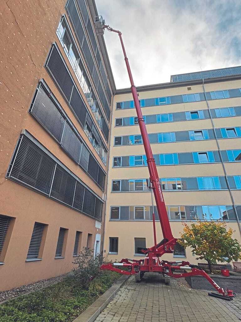 In einem kleinen Korb fährt Moritz Reiser nach oben. Der Teleskoparm des Raupenfahrzeugs, das selbst nicht mehr als 1,80 Meter in der Breite misst, bringt ihn auf die Höhe des sechsten Stockwerks des Krankenhauses. "Diesen Nervenkitzel brauche ich nicht mehr unbedingt", sagt Reiser. Ob es mit dem Alter zu tun hat? Vielleicht liegt es aber auch an der neuen Verantwortung, die er im privaten Bereich trägt: Reiser ist vor Kurzem Papa geworden.