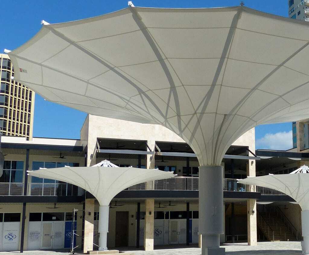 Hotels, Restaurants, Cafés – darauf hat sich der Hersteller Becher Textil- & Stahlbau mit seiner Marke BaHaMa mit seinen Großschirmen spezialisiert. Die Schirme aus dem Premiumsegment fertigt der Hersteller auftragsbezogen. Zusatzausstattungen wie TV-Systeme lassen sich konstruktiv integrieren.