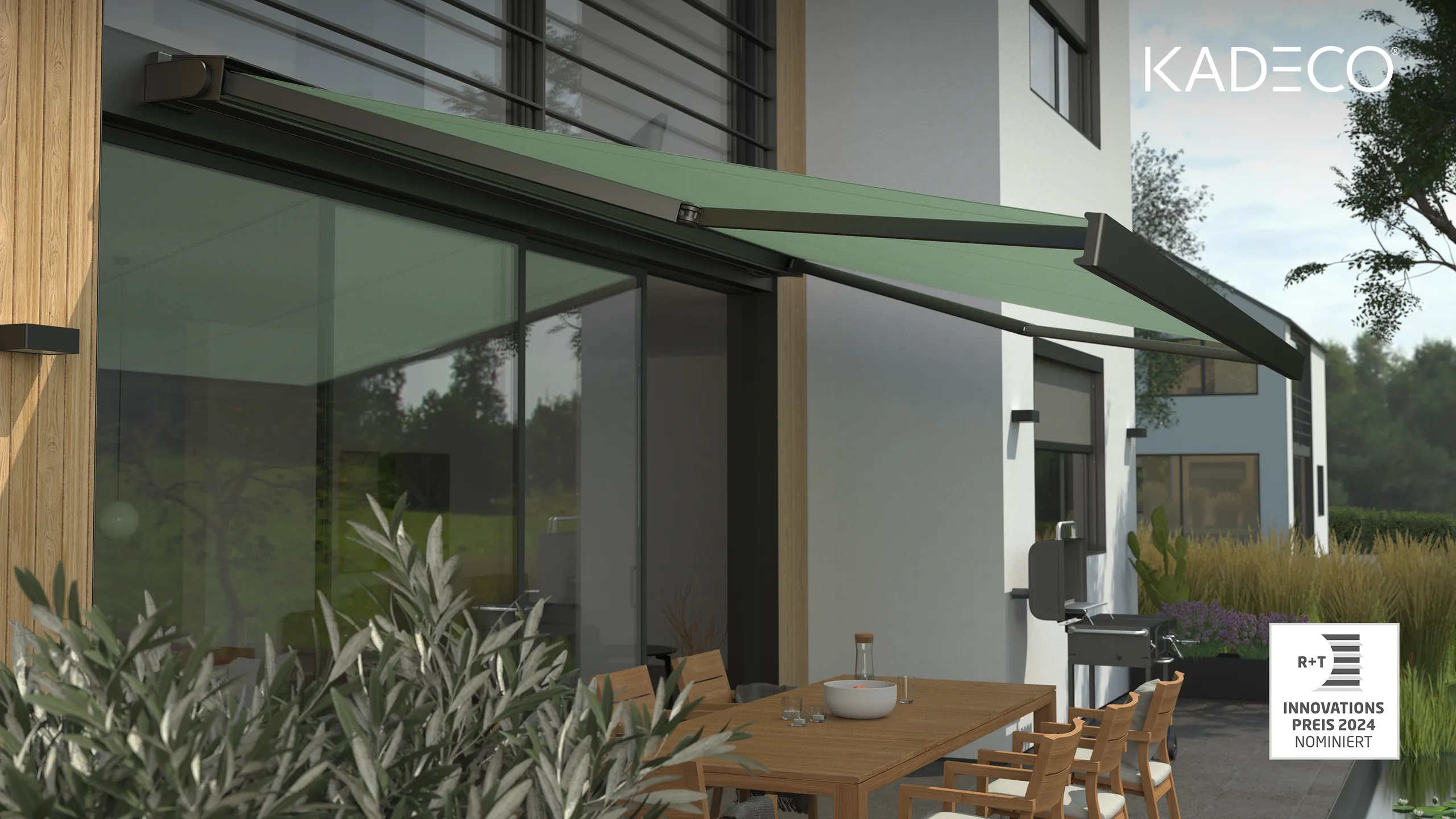 Für den R+T-Innovationspreis nominiert: Die neue Design-Markise 310 von Kadeco überzeugt mit klarer Linienführung und moderner Optik, aber auch mit technischen Besonderheiten und einfacher Montage.