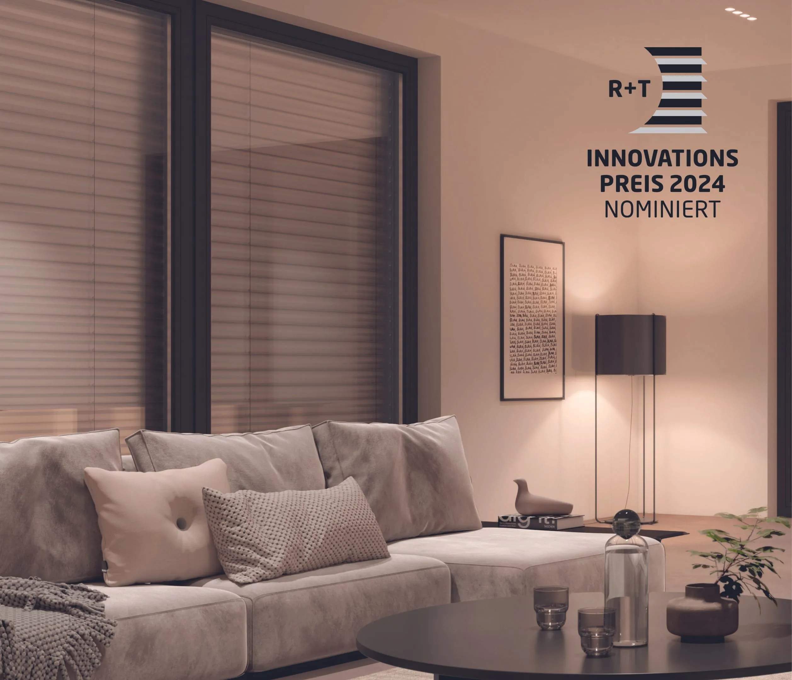 Ausgezeichnet mit dem R+T Innovationspreis in Silber: Aura Illuminated Shades von Hunter Douglas vereint die natürliche und künstliche Lichtsteuerung und erzielt so eine tageslichtähnliche Beleuchtung. Vollständig programmierbare LED-Streifen, die bei Nichtgebrauch transparent sind, ermöglichen im eingeschalteten Zustand eine stimmungsaufhellende Beleuchtung. Sie erzielen die sanfte Lichtatmosphäre wie transluszente Fensterdekorationen. "Mit Aura Illuminated Shades läst sich das Tageslicht nach Bedarf genießen und die Raumatmosphäre vollständig steuern – ob an einem trüben Tag ein warmes Licht gewünscht wird oder das Tageslicht verlängert wird – alles ist möglich!", heißt es in einer Produktbeschreibung.