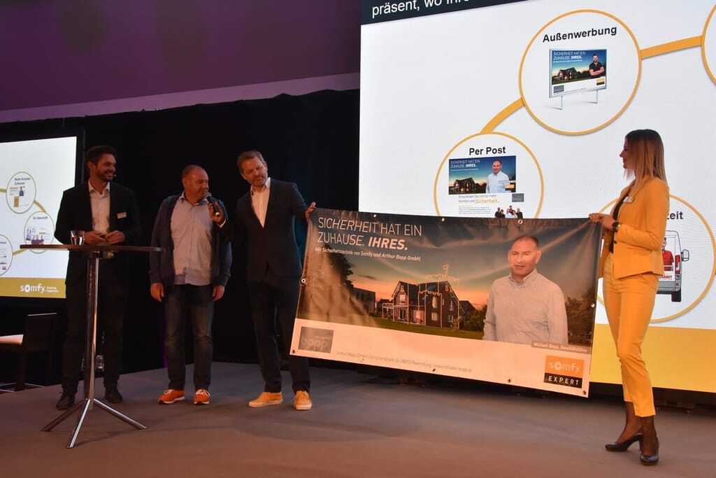 Bleibt natürlich die Frage: Wer wird denn jetzt die Plattform – Somfy, der Handwerksbetrieb oder doch Google? Jedenfalls sagt der Konzern, er nehme seine Verantwortung an – oder mit Rilling: „Vertraut uns, wir führen durch. Auch in Zukunft gibt es Märkte, auf denen jeder sein Geld verdienen kann.“ Unausgesprochen folgt der Satz: Wenn ihr, liebe Handwerker, mitspielt. Tatsächlich arbeitet Somfy an einer Markenwelt, die von der gerade noch vor Beginn der Veranstaltung per Liveschalte aus Oslo in der Familie begrüßten Biathletin Franziska Preuß bis zu Arthur Bopp, dem Somfy-Experten in Ravensburg, reicht. Der hatte die Pro Marketing-Serviceleistungen genutzt, die vom Markencoaching – hervorragend auf die Bühne gebracht von Meinhard und Manuel Berger (SuW Berger, Hallbergmoos) sowie Trainerin Christine Wicht – über ein professionelles Fotoshooting bis hin eben zu besagter Plakatkampagne reichen, in deren Zug Bopp künftig seinen Anspruch auf die Kompetenzführerschaft („Sicherheit hat ein Zuhause. Ihres.“) bei der Anforderung My home is my castle unübersehbar im 50.000-Einwohner-Städtchen dokumentiert. Dabei sind Einrichtungen wie der Senat, in dem die Hälfte der zehn Mitglieder als Rückkoppelung zwischen dem Lieferanten und seinen Profikunden alle zwei Jahre wechselt, mehr als nur Streicheleinheiten für die handwerkliche Kompetenz: „Der Innovationsprozess kommt zum Erliegen, wenn Unternehmen daran gehen, die Zahl ihrer Flops zu reduzieren“, zitiert Oliver Rilling einen anderen Guru, Management-Professor Robert I. Sutton von der Stanford University in Palo Alto. Die gestandenen Handwerksunternehmer bringen ihre Kenntnisse, ihren Blick auf die Dinge aus dem täglichen Dialog mit dem Kunden ein, durchaus auch zum Wohl des Konzerns.
