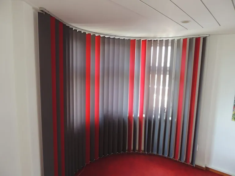 Raumausstattermeister Hubert Füßl schlug dem Kunden eine gebogene Lamellenanlage vor, um den sachlichen Charakter der Geschäftsstelle ebenso hervorzuheben wie die Architektur des Erkers. „Als Alternative wären etwa Metalljalousien möglich gewesen. Diese hätten allerdings segmentweise immer nur in einem geraden Stück montiert werden können“, erläutert Füßl. Der Charakter des Raums wäre verloren gegangen. Die Planung der gebogenen Anlage, die der Rundung des Erkers zu folgen
