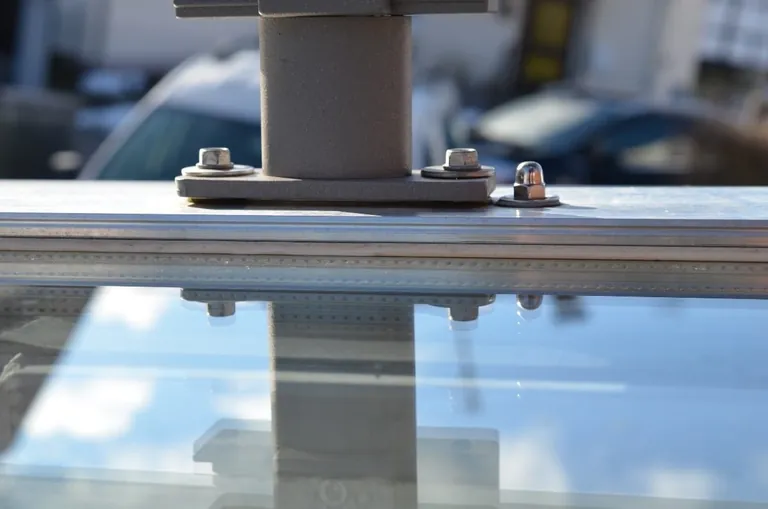Auf den Holzbalken des Wintergartens ist Zweifach-Sicherheitsglas aufgelegt und mittels einer Dichtschiene und einer Deckleiste verklemmt. Auf dieser Deckleiste verschraubten die Monteure die Halterungen für die Führungsschienen. Die Verbindung besteht allerdings nur mit der Deckleiste, nicht mit dem darunterliegenden Holzbalken. Alle auftretenden Kräfte drücken dadurch auf das Glas. Darüber hinaus gewährleisten die eingesetzten Schrauben keine ausreichende Stabilität.