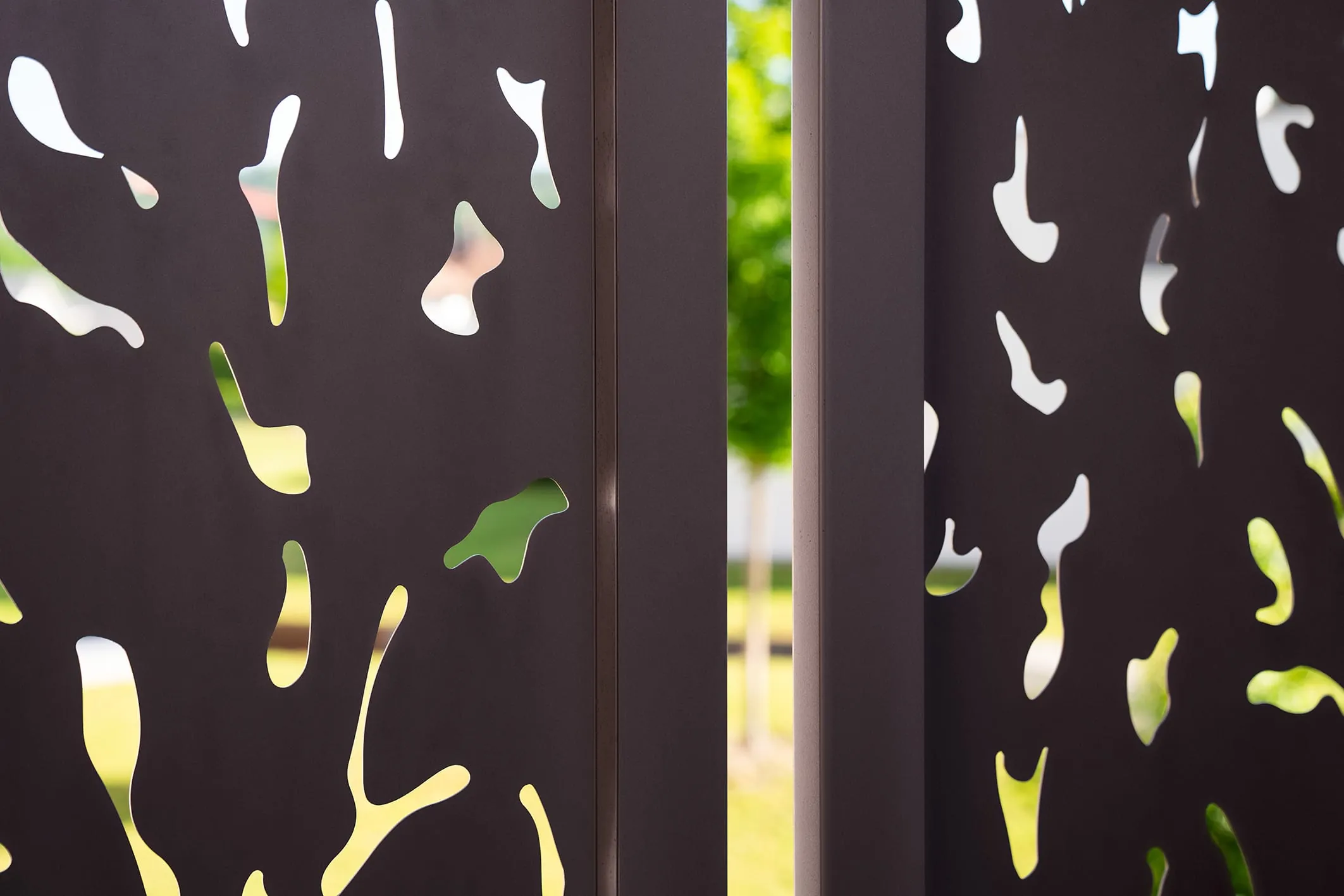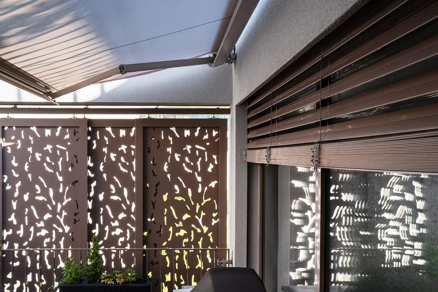 Die Schiebeläden sind nicht nur beweglich und leicht verstellbar, sondern bieten dank des speziellen Lochmusters, das extra hierfür kreiert wurde, je nach Sonneneinstrahlung einen schönen Schattenwurf mit orientalischem Hauch. Die Inspiration dazu bekam Walter Maio von fernöstlichen Atriumhäusern, die zum Himmel geöffnete Räume haben.