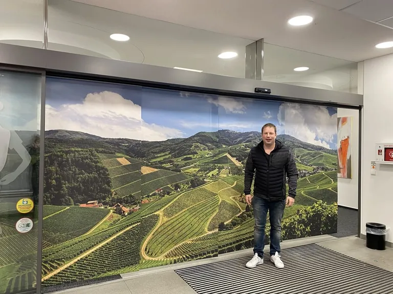 Seine Wahl fiel auf fünf Stoffpaneele mit einer Breite von 100 Zentimeter, die zuletzt noch bedruckt wurden. Schrempp installierte eine fünfläufige Flächenvorhangschiene im Eingangsbereich der Bank. Die Flächenvorhänge lieferte das Unternehmen MHZ. „Die Vorhänge lassen sich nach Lust und Laune verschieben und so anordnen, dass immer genügend Sichtschutz gewährleistet wird“, sagt Schrempp. „Um den Bankkunden außerdem ein Gefühl von Zugehörigkeit zu verschaffen, entschieden wir uns, ein regionales Bild auf die Flächenvorhänge drucken zu lassen.“ Über das zu verwendende Bild waren sich Schrempp und sein Kunde sofort einig. Die Wahl fiel auf eine Landschaftsfotografie. Das Bild zeigt die Landschaft rund um Offenburg, insbesondere die berühmten badischen Reben, in denen die besten Weine Deutschlands entstehen. Ein Sichtschutz, der ins Auge sticht und den Raum optisch aufwertet.