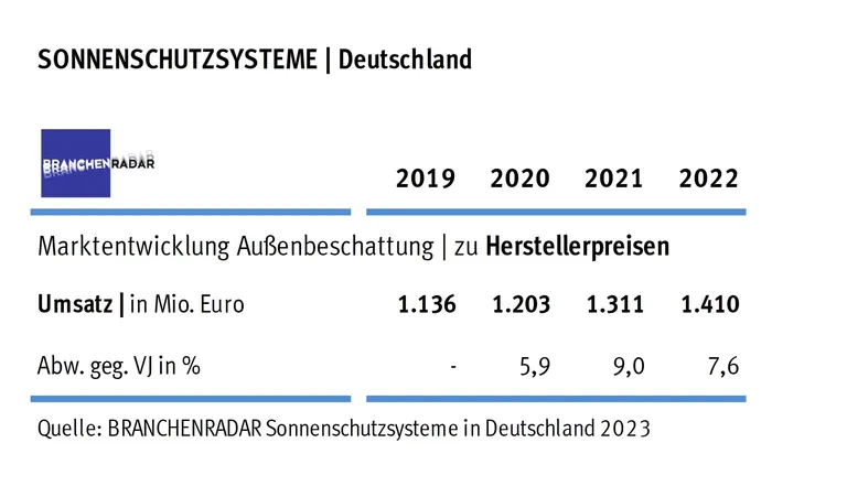 Bereits das zweite Jahr in Folge bescherten steigende Verkaufspreise dem Markt für Außenbeschattungen ein signifikantes Umsatzplus. Laut aktuellem Branchenradar Sonnenschutzsysteme in Deutschland wuchs der Herstellerumsatz im Jahr 2022 um 7,6 Prozent gegenüber dem Vorjahr auf insgesamt 1,41 Milliarden Euro, obgleich die Nachfrage im Jahresabstand um 1,5 Prozent sank.