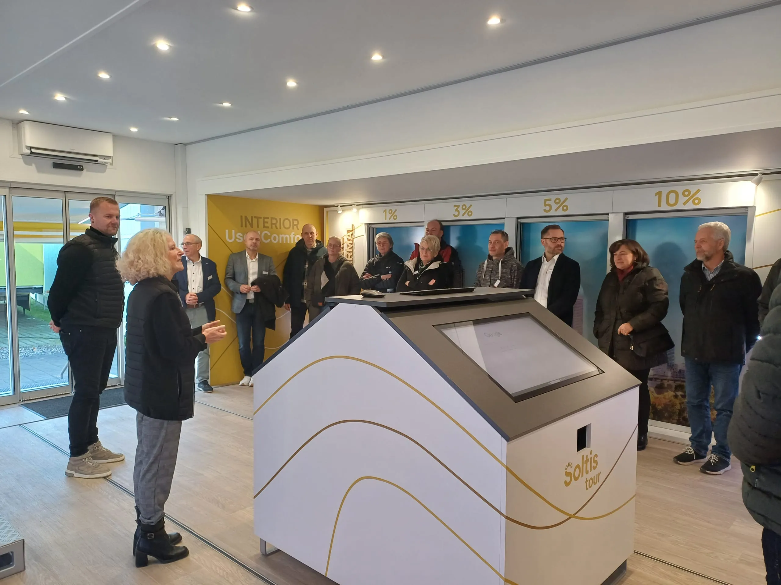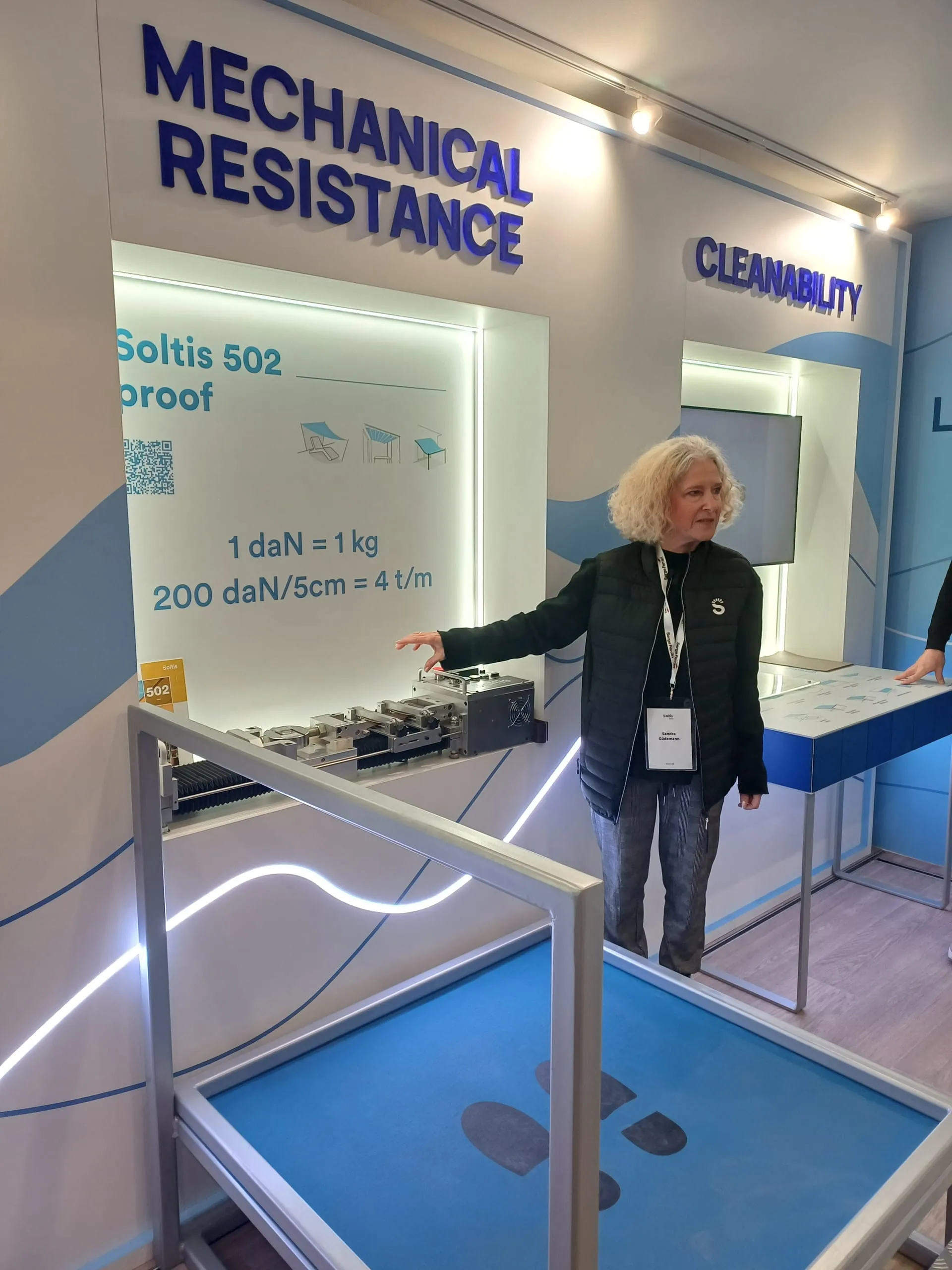 Ebenfalls neu bei Soltis ist das besonders nachhaltige Gewebe 502 proof, das zu 100 Prozent aus recyceltem Polyestergarn besteht. Neben den Neuheiten sind im Truck auch verschiedene Prüfstationen aufgebaut, die die Schmutzbeständigkeit, Reißfestigkeit, Wasserdichte und Schimmel- und UV-Resistenz der Soltis-Gewebe veranschaulichen.