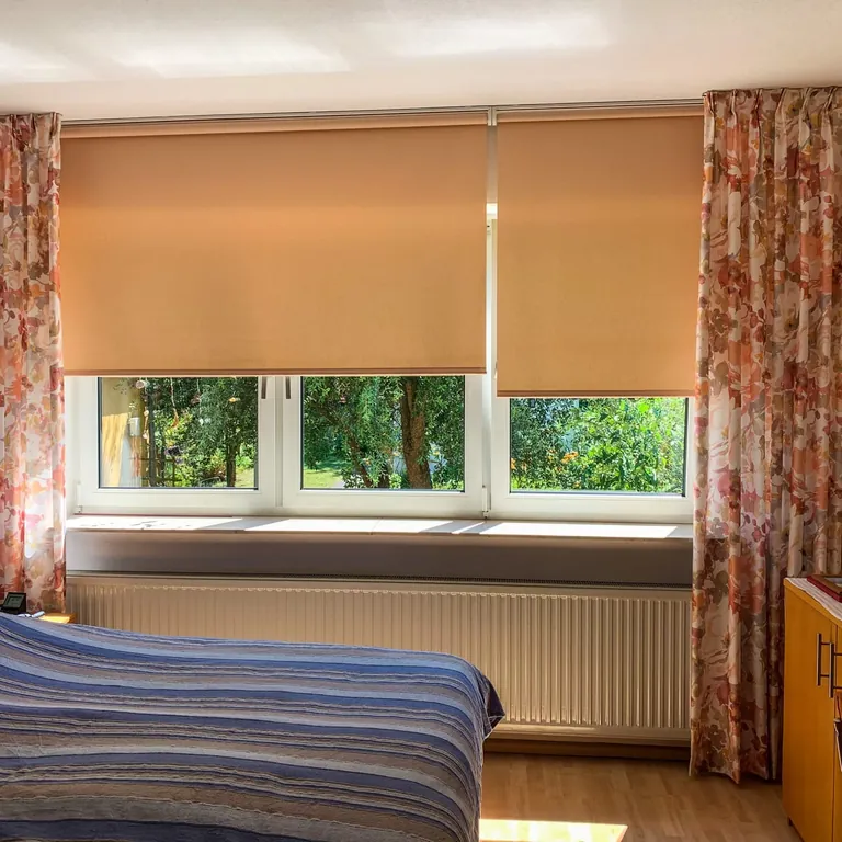 In dem kleinen Häuschen in Offenbach am Main wurde ein Schlaf- und Wohnzimmer mit neuen Sonnenschutzrollos zu versehen. Der Clou dabei: Sie sollten die Räume nicht komplett verdunkeln, sondern lediglich die Sonne abschirmen und weiterhin Licht hereinlassen.