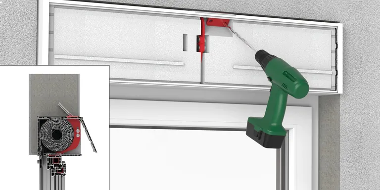 Auf der Baustelle wird der Kasten schräg auf den Rahmen des Fensters aufgesetzt. Die Form des beweglichen Fallriegels folgt der Kontur des zuvor montierten Spezialverstärkungseisens und rastet automatisch ein. Dies gelingt dem Hersteller zufolge auch bei sehr breiten Elementen mit mehreren Konsolen einfach. Das bereits vollständig integrierte Statik-Konsole werde nun mit zwei Schrauben in der Decke befestigt. Für die Montage von innen werde die Abdeckung des Kastens auf der Innenseite abgenommen und die Konsole schnell verschraubt. Ist eine Montage von unten erforderlich, werde die untere Abdeckung entfernt, der Panzer abgelassen, die Innendämmung entnommen und die Konsole verschraubt. Bei Kästen, die überputzt werden sollen, sei die Montage ohne Öffnen des Kastens von innen möglich. Hier werde bei der Konfektion der Putzträger an der Schraubstelle weggelassen. Nach Verschraubung der Konsole durch die Öffnung in der Innenblende werde der Dämmkeil durch den Monteur einfach eingeklebt.