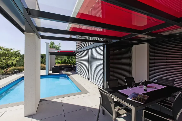 Ein Highlight ist dabei die exklusive Terrassengestaltung an der Südfassade. Geplant und umgesetzt sind zwei Freisitze, räumlich getrennt durch einen Außenpool. Zwei über der Verglasung angebrachte Pergola-Markisen des Typs P40 von Warema sorgen stilvoll für den Hitzeschutz. Der Wandvorsprung ist durch eine einseitige Verlängerung der Führungsschiene als Sonderlösung optisch integriert. Die Montage erfolgte mithilfe einer U-förmigen Winkelkonstruktion. Die Folge ist eine außen liegende Beschattung der bis zum Rand durchgängigen Glasfläche.
