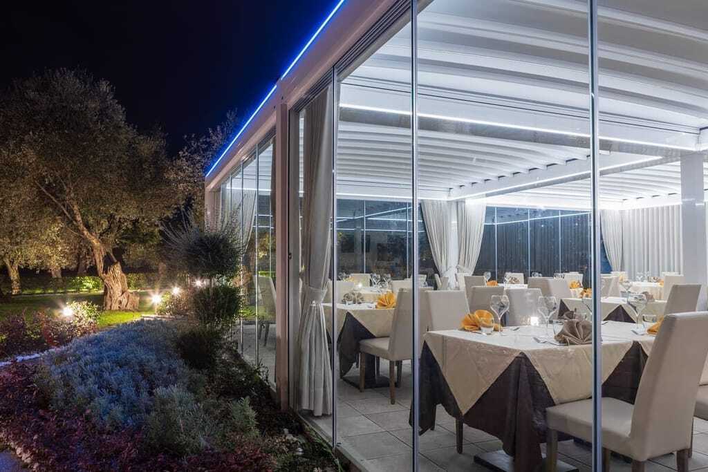 Der KE Store Händler Arredamenti Crispino konzipierte passend zu dem typischen Bauernhausstil einen neuen Außenbereich. Die Designer wählten die Pergola-Markise Gennius Isola 3 von KE mit LED-Beleuchtungskit und Panorama-Glasschiebewänden. Seitlich hermetisch verschließbar, passen sie sich an die klimatischen Bedingungen an. Das Flachbogendach ist mit Ferrari Blockout von Giovanardi in einer mattweißen Nuance ausgestattet. Der zirka 100 Quadratmeter große Außenbereich ist ganzjährig nutzbar und garantiert die Privatsphäre der Gäste, da die Tische mit ausreichend Abstand aufstellbar sind. Die LED-Leuchten entlang der Markise sorgen für stimmungsvolle Lichteffekte bei Sonnenuntergang, während die drapierten Vorhänge einen Hauch klassischer Eleganz verleihen und an den Stil der Einrichtung des Restaurants erinnern.