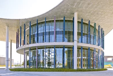 Die Realisierung des Projekts erforderte thermischen und visuellen Komfort gleichzeitig – deshalb kam nur das Double-Face-Gewebe S2 1 Prozent infrage. Der für die Weltausstellung 2008 in Saragossa errichtete, ehemalige spanische Pavillon im Justizviertel beherbergt heute die Amtsräume sämtlicher Richter der Region. In dieser von intensiver Sonneneinstrahlung geprägten Gegend war für das Gebäude mit seiner rundum zu 100 Prozent aus Glas bestehenden Fassade ein wirksamer Sonnenschutz unerlässlich.