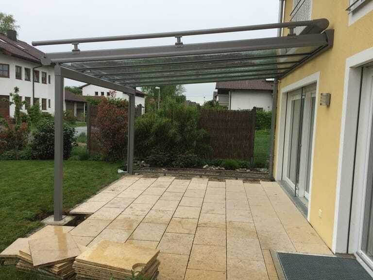 Danach wurden die Pfosten mit der Pfette verschraubt und auf die vorhandenen Fundamente gestellt. „Wir montierten den Sparren links und rechts außen und stellten so den Dachüberstand über der Pfette ein“, schildert der Experte. Nachdem die Fachleute Pfosten und Sparren fest verschraubt hatten, stand die „Herausforderung des Tages“ an, wie Reiser betont. „Wir mussten die zehn Millimeter dicken Glasscheiben in die Pfetten einbringen und montieren.“ Vereinfacht habe dies eine ausgeklügelte Montagehilfe von Erhardt Markisen. „Trotz der Schwere des Glases war das dann eine recht flotte Angelegenheit.“ Im Anschluss brachten die Monteure die Glasleisten und die Dichtungsgummis an. Es folgten die Dachrinne und der Regenablauf. Abschließend montierte das Team die Aufdach-Wintergartenmarkise und die Bodenschiene für ein Ganzglas-Schiebeelement. „Völlig durchnässt, aber zufrieden traten wir die Heimreise an“, fasst Reiser die Montage zusammen.