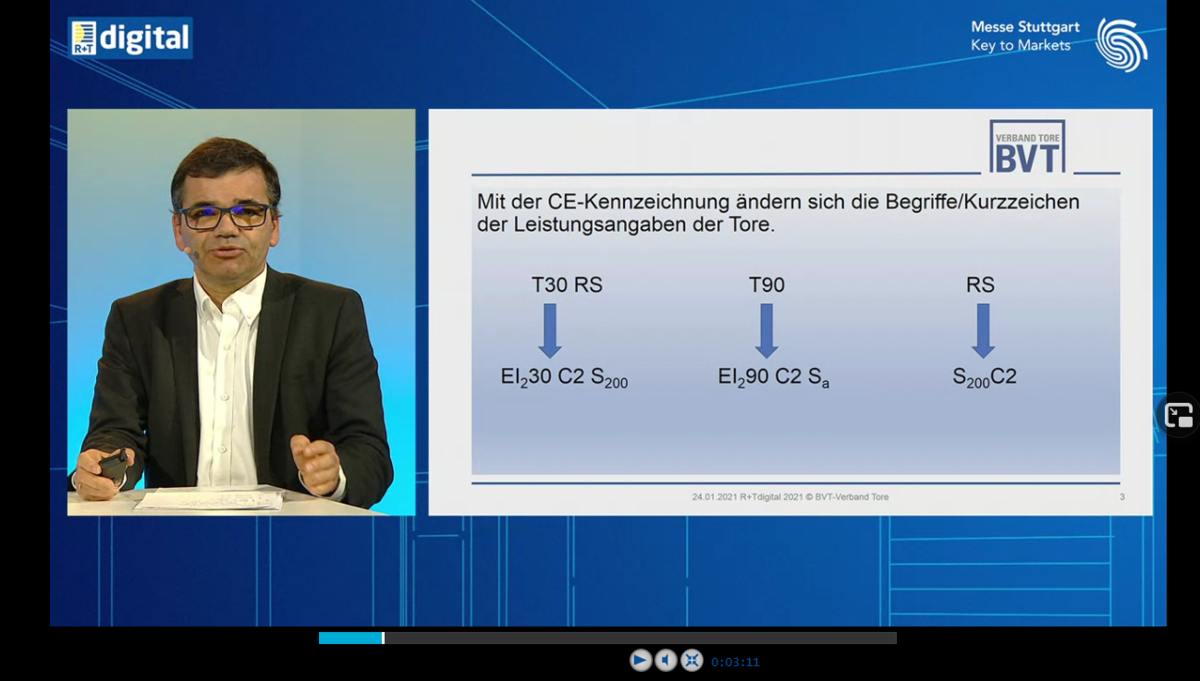 Das T30 RS Tor heißt aufgrund der neuen europaweiten CE-Kenn zeich nung nun EI230C2S200. - © Screenshot Messe Stuttgart