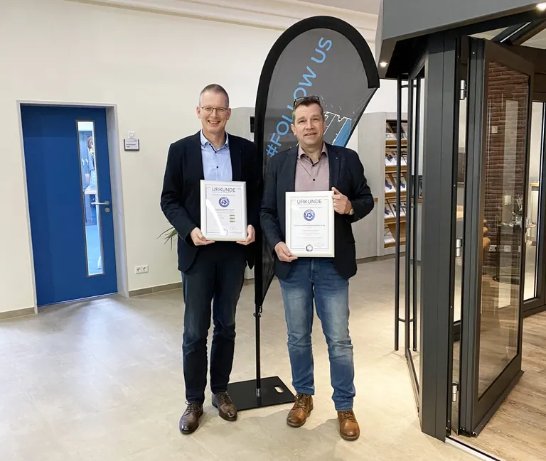 TS-Aluminium Geschäftsführer Rainer Trauernicht (li.) und Martin Kötter freuen sich über die Zertifizierungen des Bundesverbands Wintergarten. - © TS-Aluminium