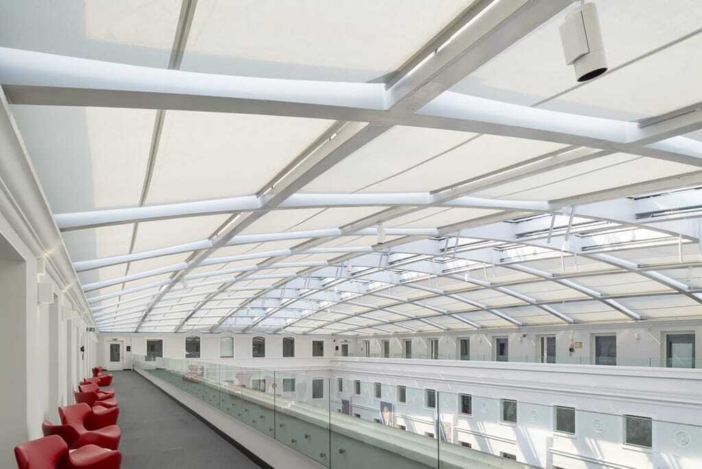 Bei einer gründlichen Sanierung des Centre William Rapport in Genf, in dem seit 1995 die World Trade Organization (WTO) untergebracht ist, erfolgte die Überdachung des Innenhofs mit einer ellipsoiden Glaskuppel. Als effektives Wärmeschutzschild fungieren großformatige Screens aus Soltis 92 von Serge Ferrari, die für einen hoch wirksamen Wärmeschutz bei gleichzeitig hohem natürlichem Lichteintrag sorgen.