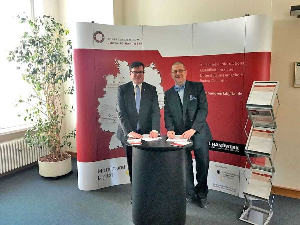 Der Hauptgeschäftsführer des Bundesverbandes Rollladen + Sonnenschutz (BVRS), Christoph Silber-Bonz, und der Leiter der Abteilung Wirtschafts-, Energie- und Umwelt-politik des Zentralverbandes des Deutschen Handwerks (ZDH), Dr. Alexander Barthel, haben kürzlich in Berlin eine Kooperationsvereinbarung über eine Transferpartnerschaft im Rahmen des „Kompetenzzentrums digitales Handwerk“ (KDH) unterzeichnet.