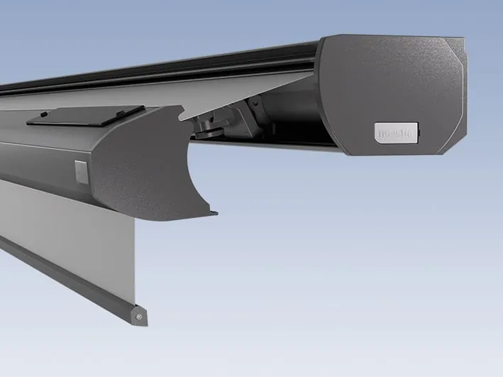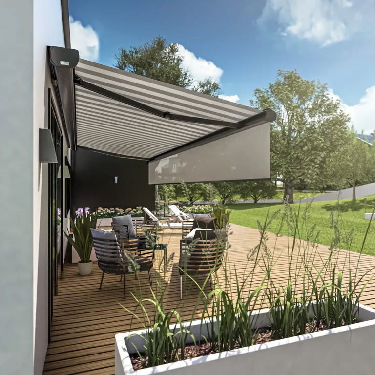 Ein Highlight bei der Novetta Plus F ist das optionale Volantrollo, das vor tiefstehender Sonne schützt. Dieses kann nun auch mit einem autarken Antrieb auf Photovoltaik-Basis automatisiert werden. Das ist ohne Schalter und Hirschmannstecker möglich, die Novetta Plus F und das Volantrollo sind gemeinsam mit einer Fernbedienung steuerbar. So lässt sich der gewünschte Schatten komfortabel und individuell richtig positionieren.